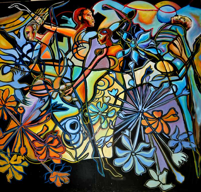 Barksdale’s work is seen in art shows across the U.S. Not only do his paintings hang in clubs, businesses and private collections, his striking large-scale murals have also brought him a lot of attention and numerous commissions. He recently completed a 30 foot-high mural for the Beltline, Atlanta’s ambitious urban redevelopment project. Rob Brawner, the project’s program director, was impressed and had this to say, “Corey was able to bring the Atlanta Beltline alive through his colorful interpretation of the project.”