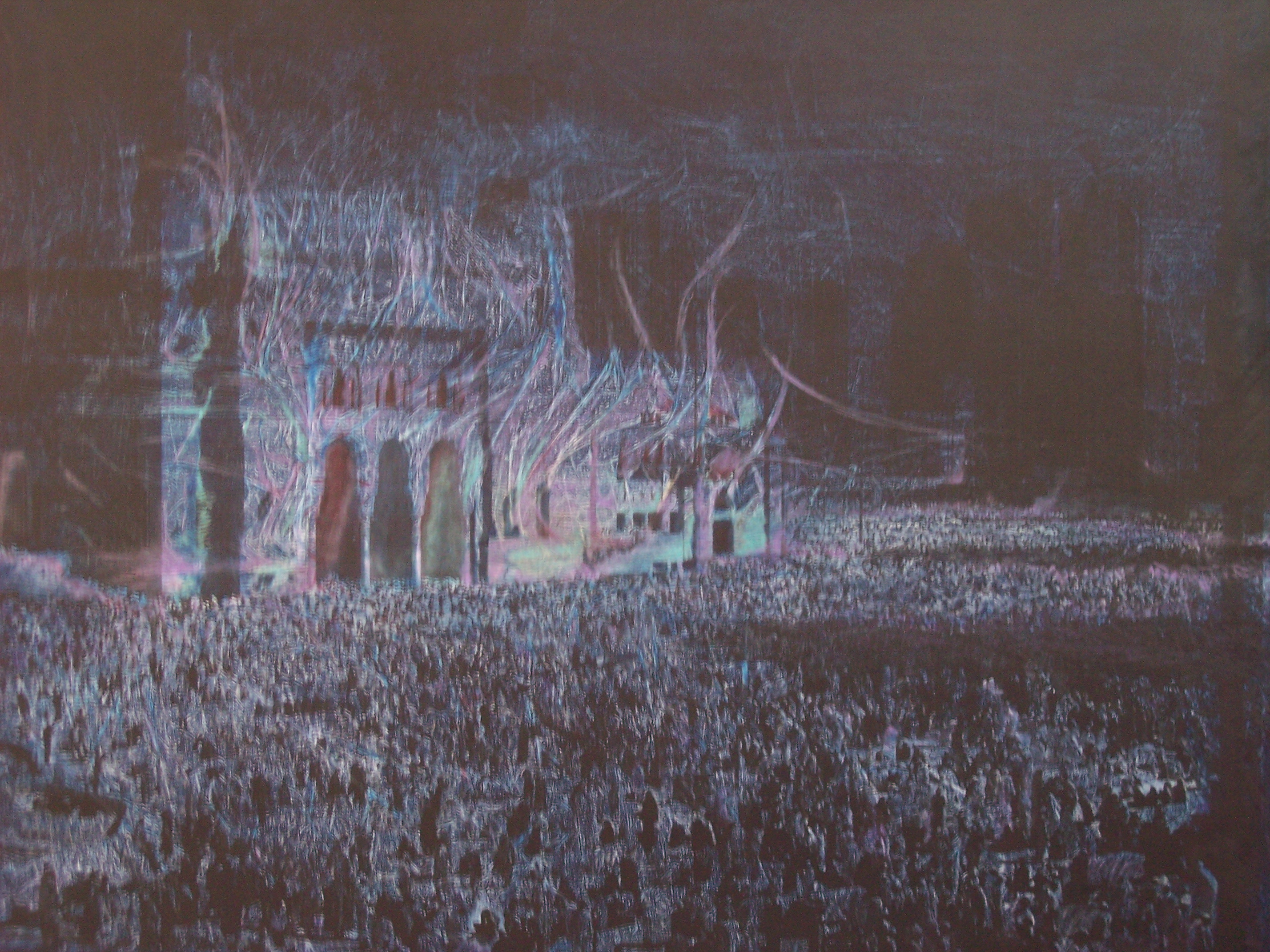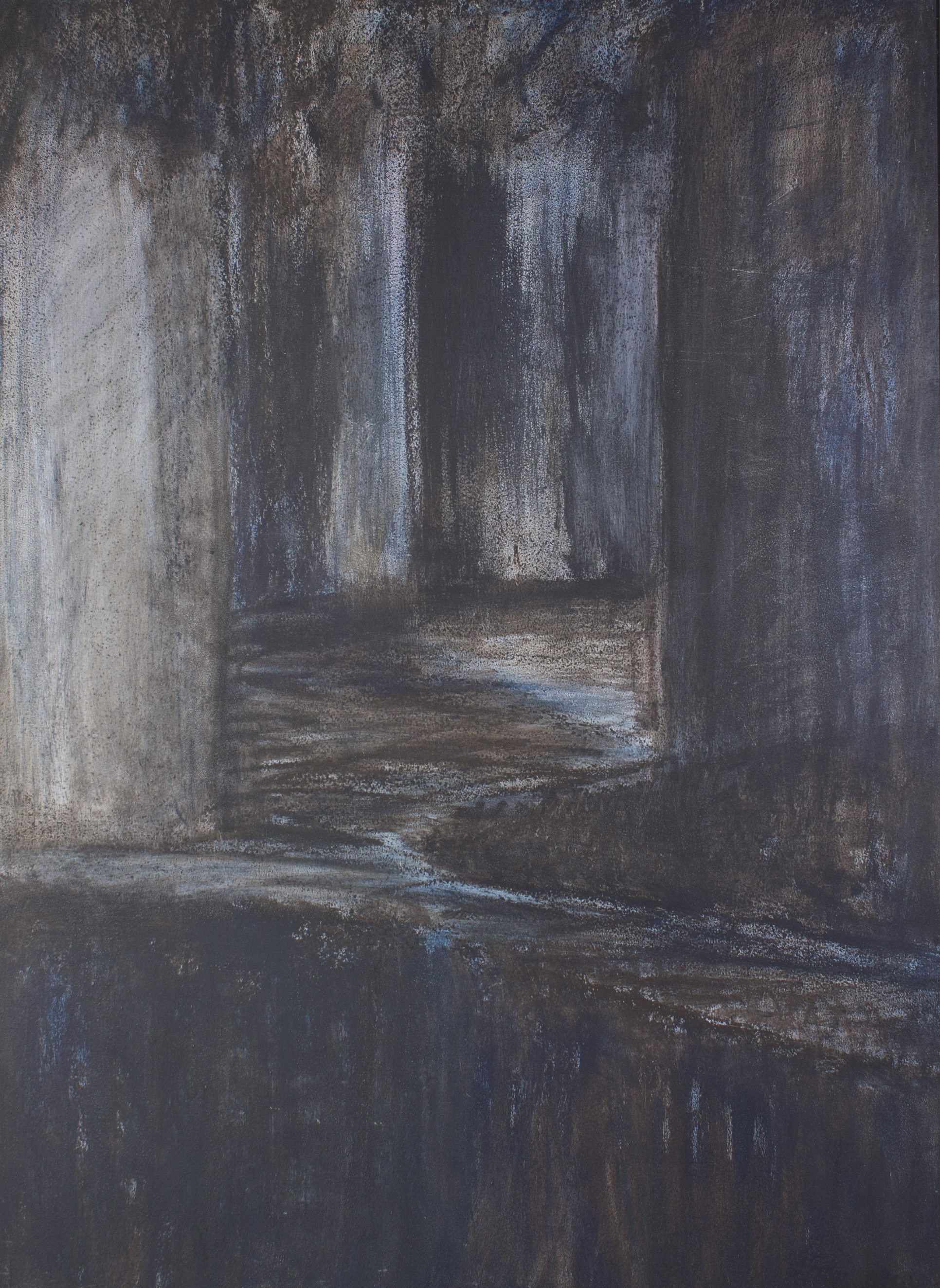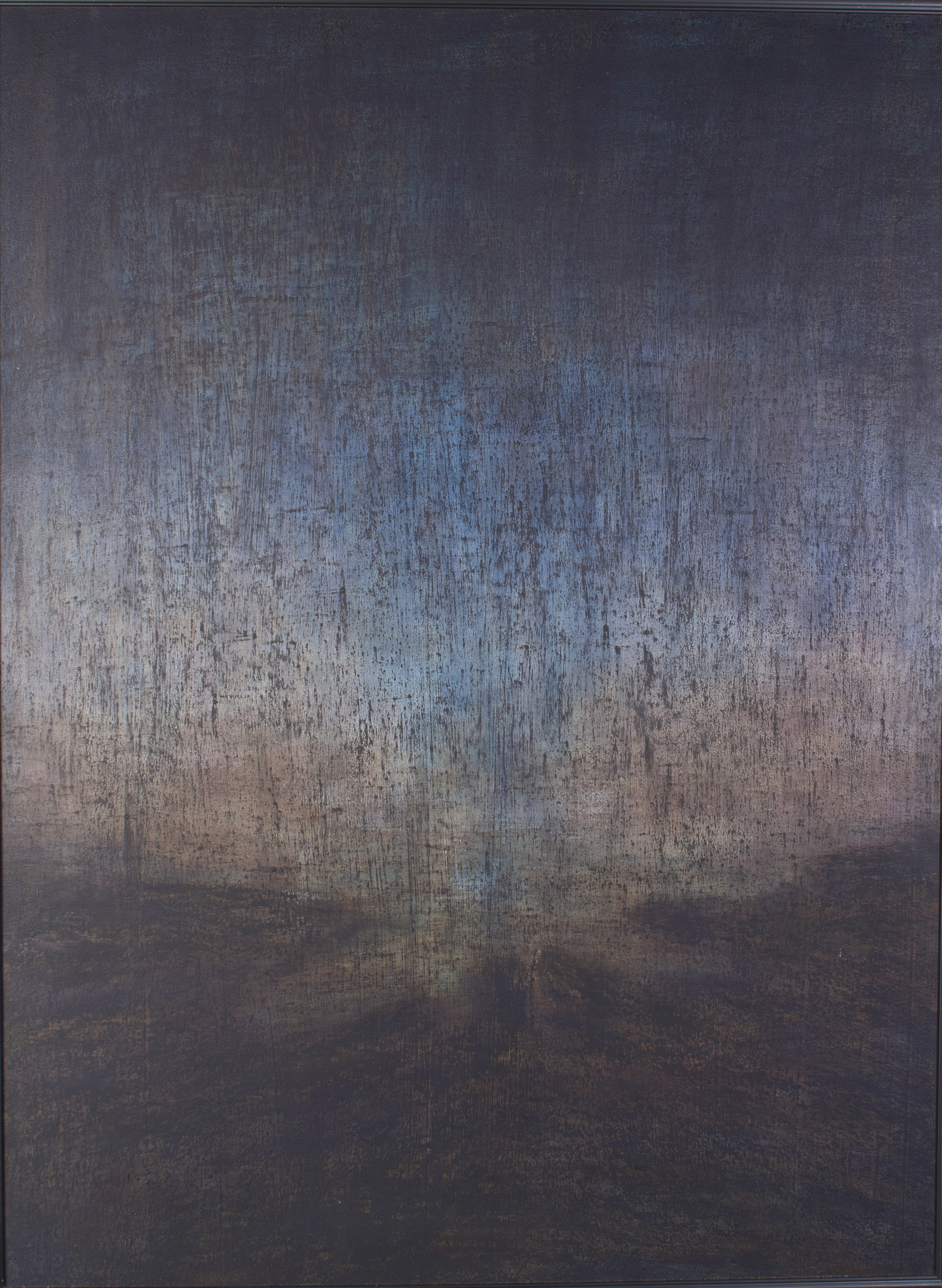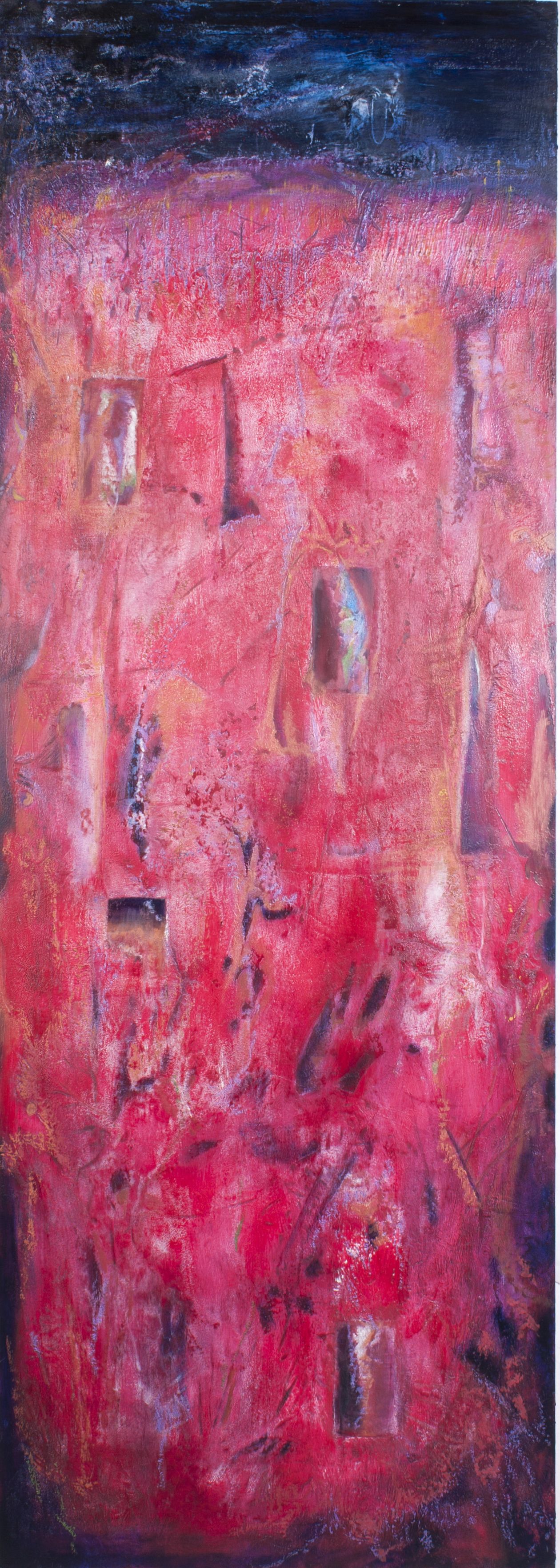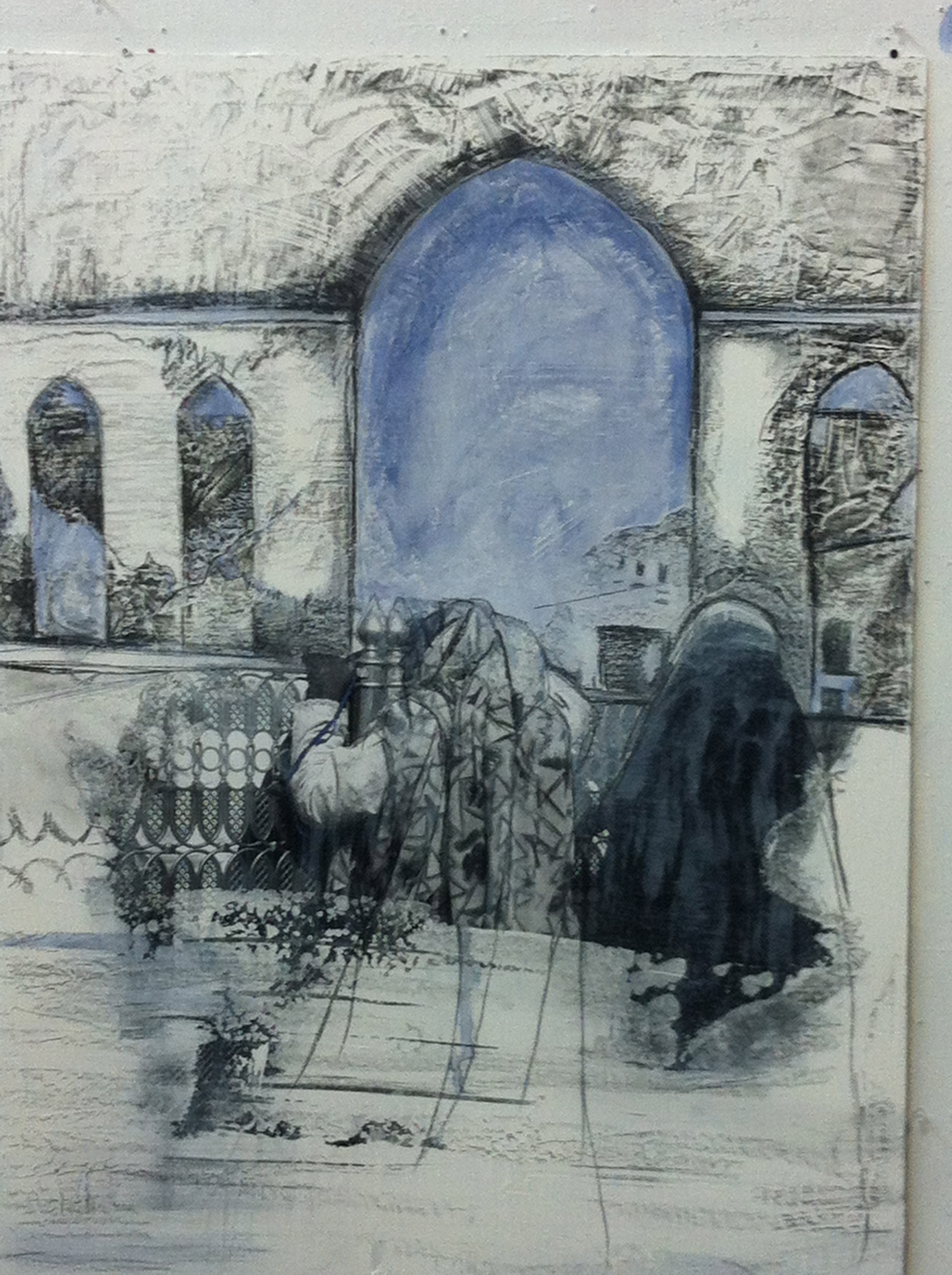 Above and Below was first used in the 911 Series in describing the turbulent event that occurred in the skies above New York City and its affect upon the world below. This piece has influenced the perspective through which the viewer is positioned below the horizon line, placing the viewer below the ard (earth). She continues to use the door size framework in Above and Below series that symbolizes a metaphorical entry to an unseen world. Verses from the Holy Quran are referenced throughout her work, and continue to be a source of inspiration.